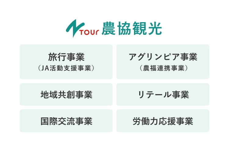 現在、旅行事業(JA活動支援事業)を始めとし、地域共創事業/国際交流事業/リテール事業/労働力応援事業/アグリンピア事業(農福連携事業)の6事業に取り組んでいます。旅行事業を中心に、地域の人を盛り上げ、さらに地域に人を呼びこみ地域を盛り上げる、2つの観点から地域活性化に貢献しています。