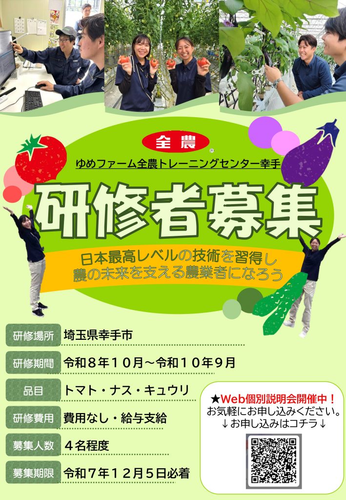 令和8年に埼玉県幸手市に設置する新規就農者向け研修施設「ゆめファーム全農トレーニングセンター幸手」(@埼玉県幸手市)にて研修者の二次募集を開始いたします!